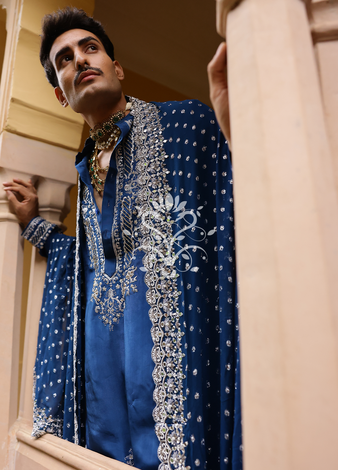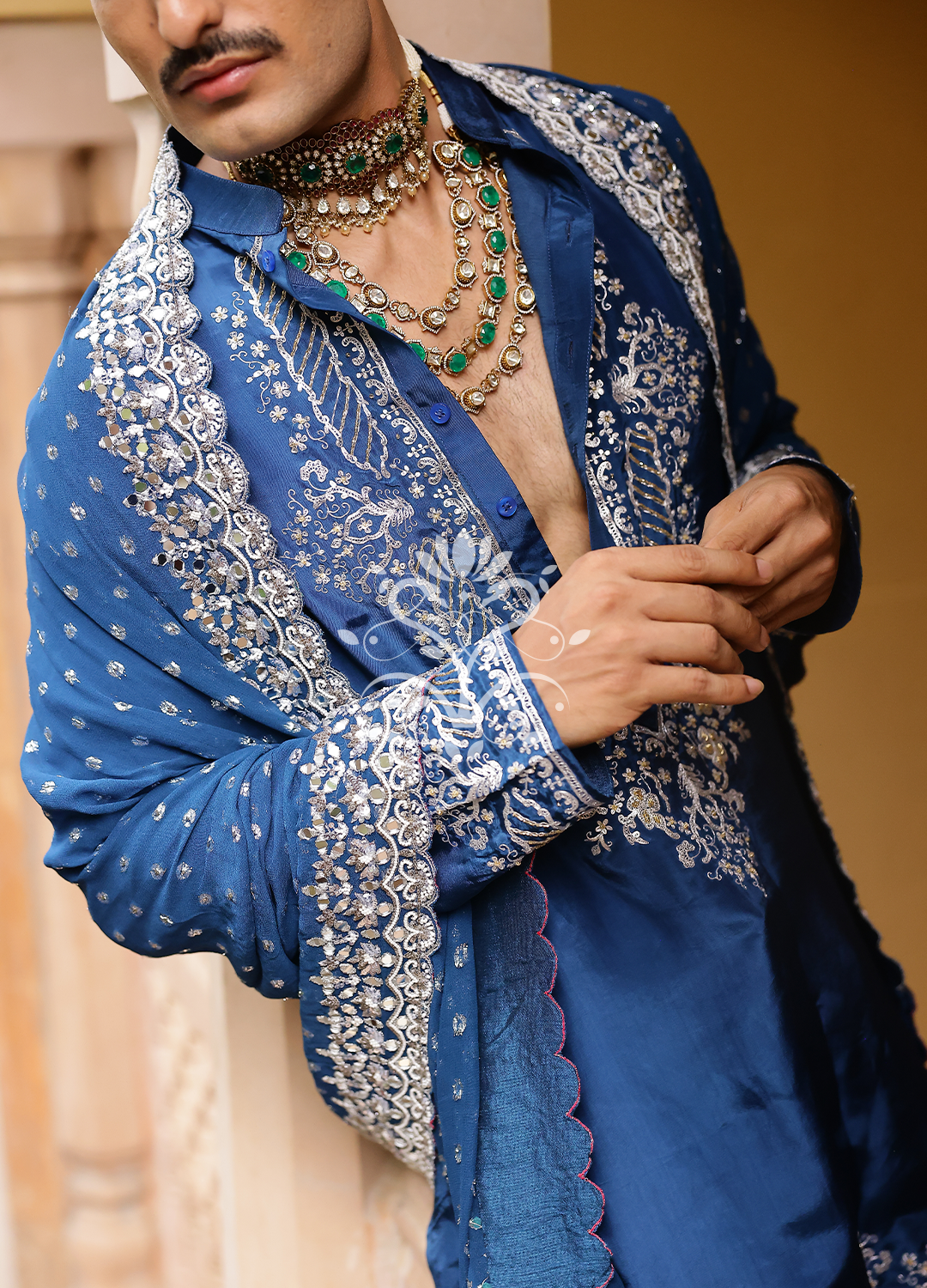 A princely silhouette drenched in deep sapphire, adorned with mirror and thread artistry that speaks of stories passed through generations.